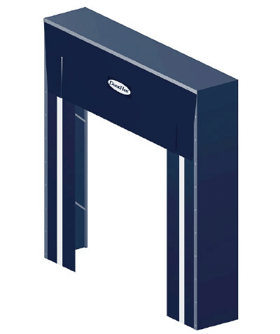 Герметизатор проема занавесочного типа со складной рамой предназначен для герметизации пространства между погрузочным доком и кузовом грузового автомобиля. При проведении погрузочно-разгрузочных работ кузов грузового автомобиля частично въезжает внутрь герметизатора. Верхний и боковые вертикальные листы при этом обеспечивают герметичность проема для погрузочно-разгрузочных работ.