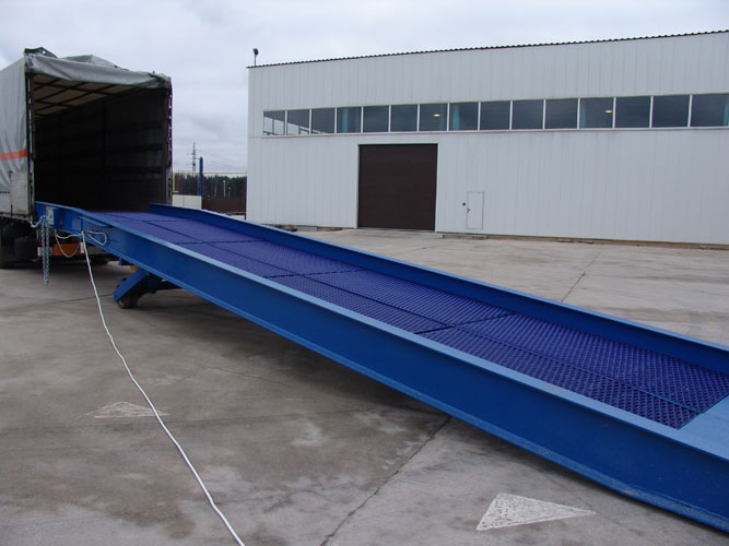Мобильные рампы используются в том случае, когда в помещении отсутствуют пандусы и производить загрузку/разгрузку автомобилей необходимо непосредственно с земли. Рампа обеспечивает прямой доступ погрузчика в кузов грузовика. Подъем/опускание устройства осуществляется с помощью ручного или электрогидравлического привода, оборудованного системой безопасности. Перемещение рампы производится также при помощи погрузчика.