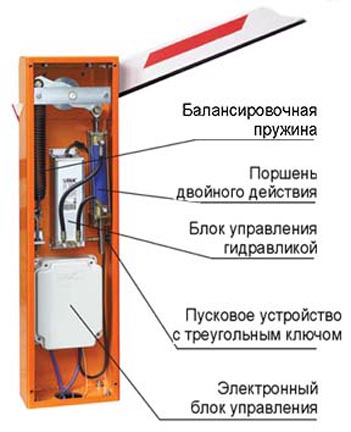 По принципу действия шлагбаумы могут быть электромеханическими и гидравлическими. Силовой механизм электромеханических шлагбаумов содержит электродвигатель, редуктор и балансировочную пружину. В гидравлических шлагбаумах стрела приводится в движение гидроприводом и балансировочной пружиной.